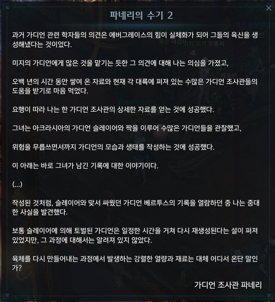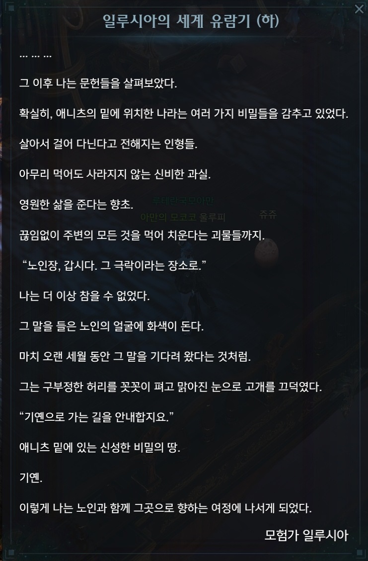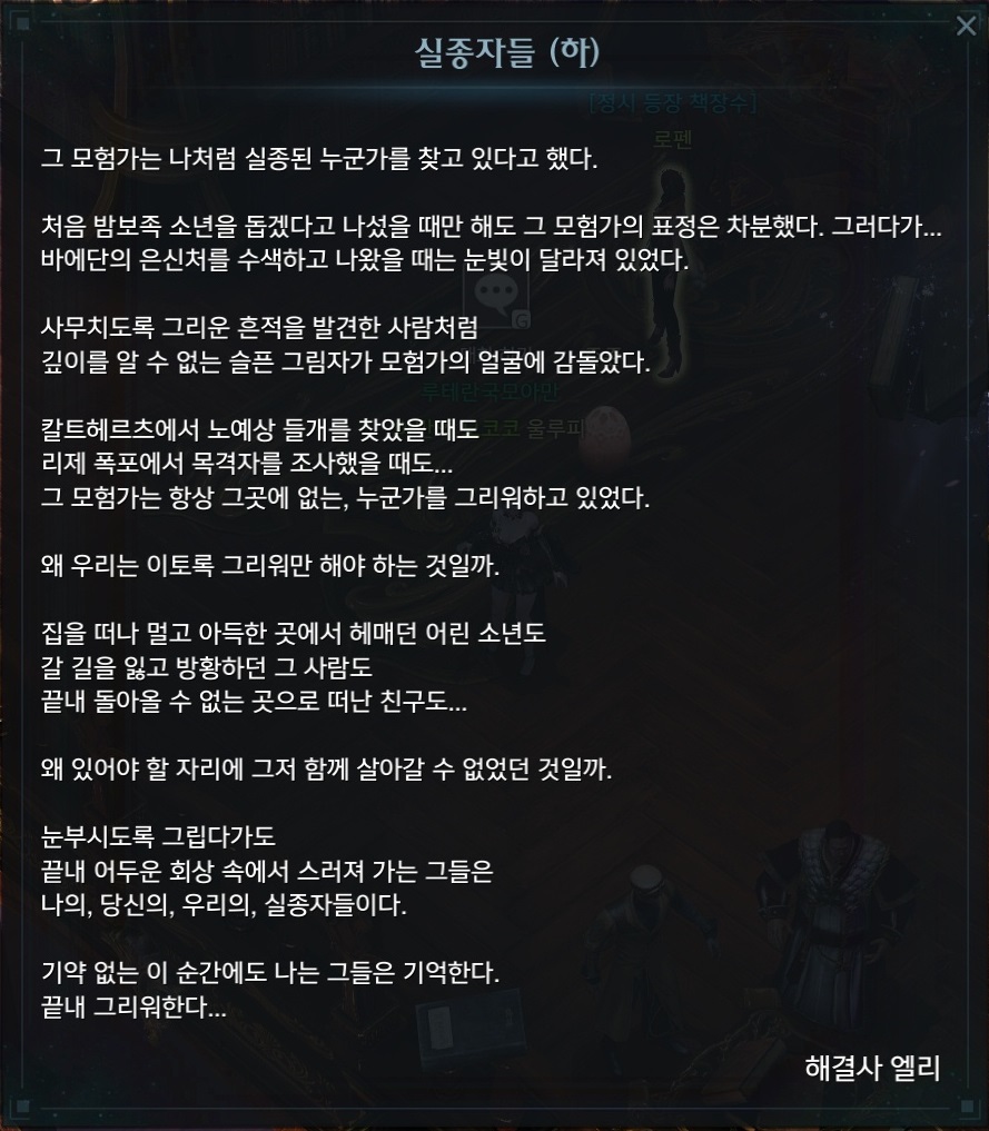 여정&각성 퀘스트 초반에 함께 했던 해결사 엘리의 수기.