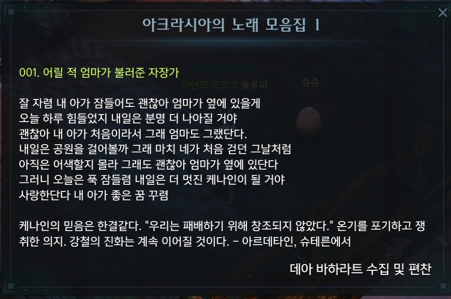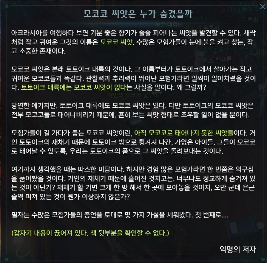 npc가 파는 물건 중 하나인데 '아크라시아 밖의 과거'라는 문구가 의미심장해서 캡쳐.